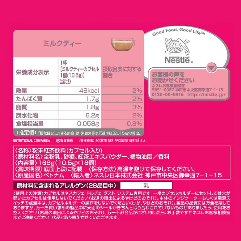 【アレルゲン情報】:原材料に含まれるアレルゲン(28品目中)乳 【原材料名】:全粉乳、砂糖、紅茶エキスパウダー、植物油脂/香料 【原産国】:ベトナム 【輸入者】:ネスレ日本株式会社神戸市中央区御幸通7-1-15