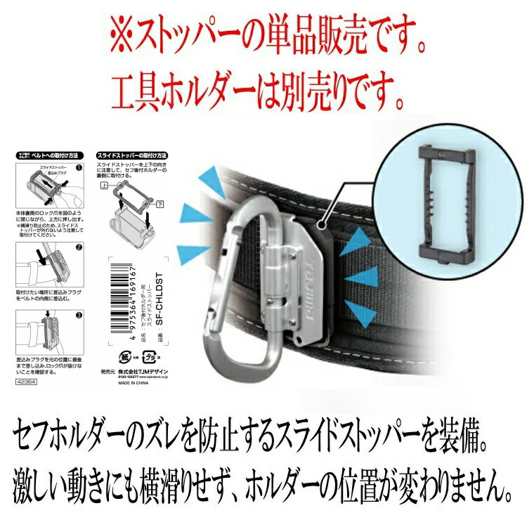 ■タジマ TAJIMA セフ後付ホルダー SF-CHLDSTセフ後付ベルトホルダー用スライドストッパー ■機能 適合:後付セフホルダーSF-CHLD セフ後付ベルトホルダー用スライドストッパー ■素材 本体:ナイロン樹脂 ※PC環境によって色の差異がありますのでご了承下さい。