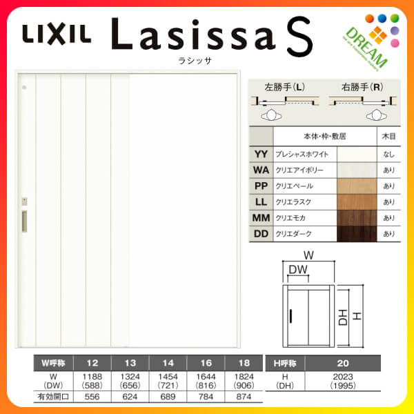 DIYに関する情報 必要技能:大工さん、建具屋さん 必要工具:電動ドリル、電動ドライバー、他 【商品説明】 【納まり図】 LIXIL/リクシルの室内建具 インテリアリビング建材 ラシッサ S  ラシッサS(Lasissa S)はファミリーライン(FamilyLine)、ウッディーライン(WoodyLine)の後継商品シリーズで、合わせやすい色目に幅広くオーソドックスなインテリアをカバーするクリエカラーが特徴です。