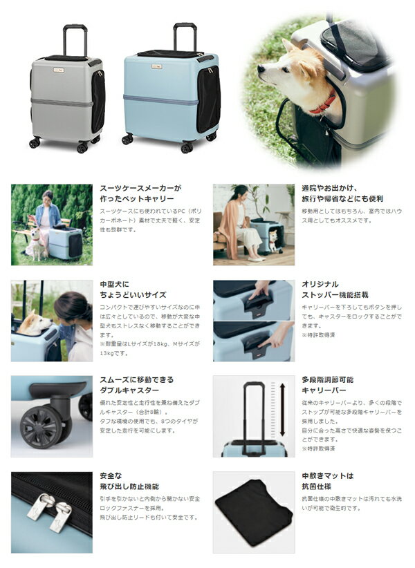 ▼Lサイズ仕様▼ タイプ[高さ](cm) 47cm 本体サイズ(cm)47×47×38 全体サイズ(cm)53×48×39、3辺の和140cm ペットサイズ目安 小型犬2匹or猫2匹or中型犬1匹 重量(kg)4.3kg 容量(L)80L ※公共交通機関を利用する場合は、利用する機関の規則に従ってください。