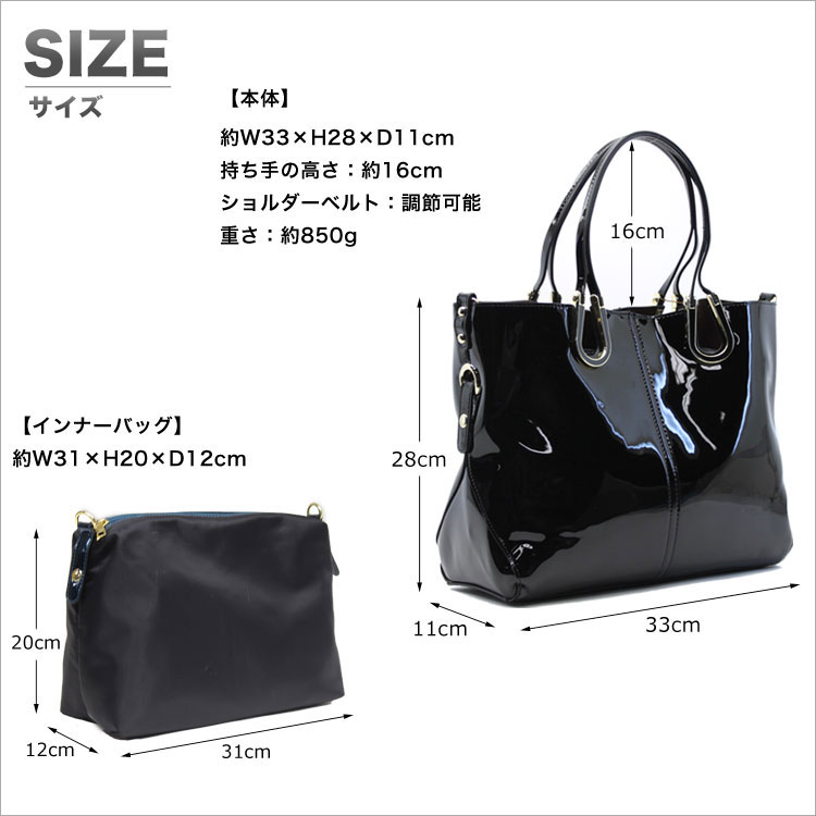 ・商品スペック サイズ (約)W33×H28×D11cm 重量 (約)850g 素材 合成皮革/エナメル仕上げ 仕様 ■インナーバッグ内部:オープンポケット×2、ファスナーポケット×1 ■ショルダーベルト付属:長さ調節可能 ■A4サイズ対応 ・ご注意事項 ※お使いのモニターやデバイスの調整により、画面上の色と若干の違いが感じられる場合がございます。