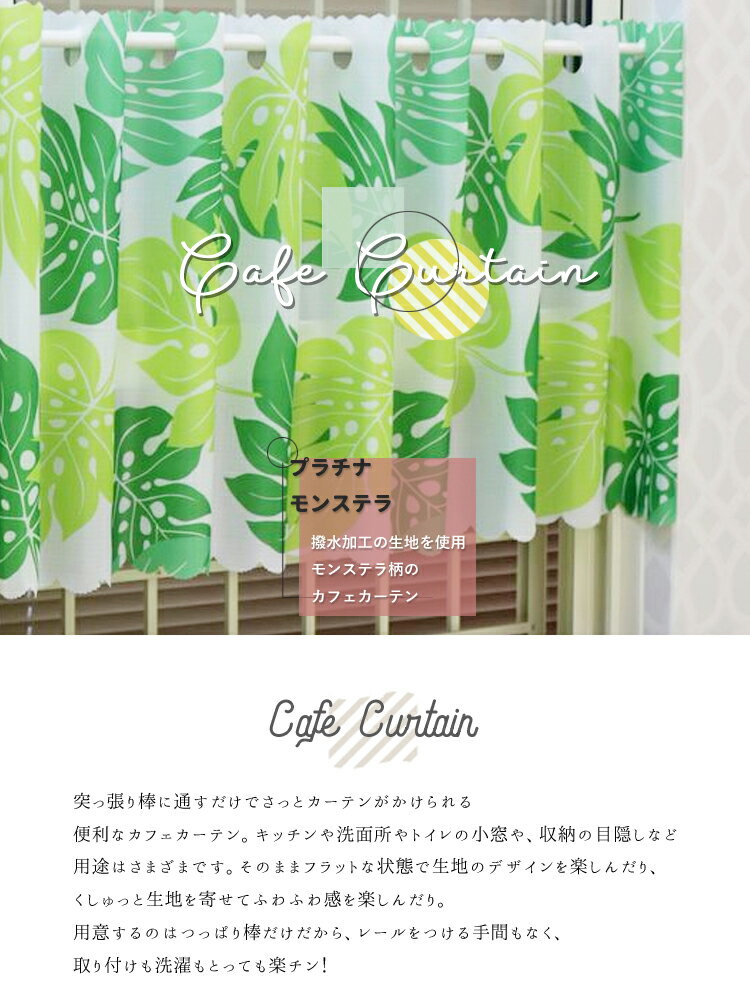 【メール便可】カフェカーテン プラチナモンステラ 撥水 植物 大人 小窓 キッチン トイレ お風呂 戸棚 目隠し アクセント 二重 つっぱり棒 メール便