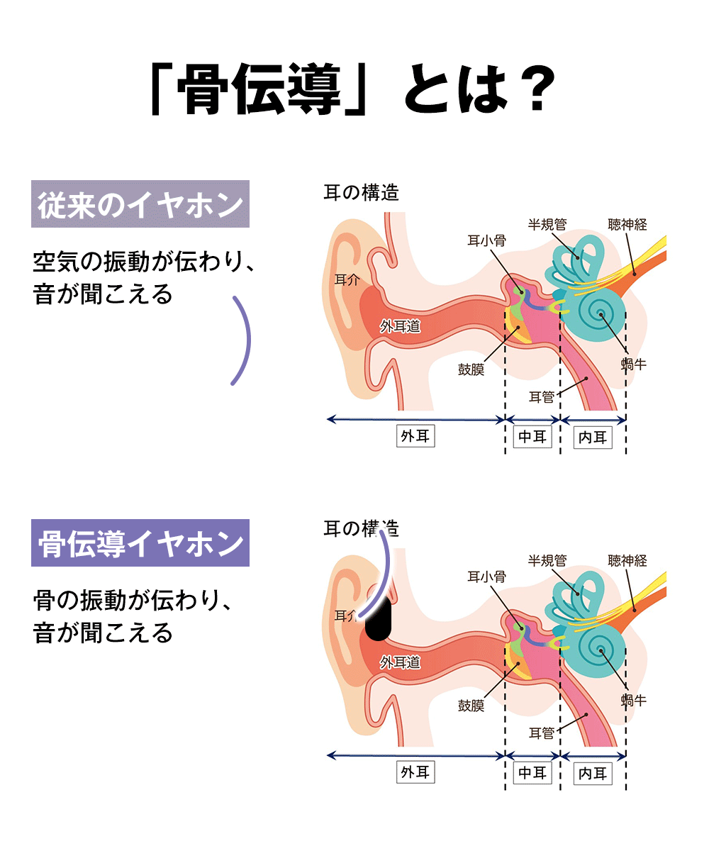 骨伝導技術により、耳をふさがず快適に開放感をもって音楽を楽しめる骨伝導イヤホン。