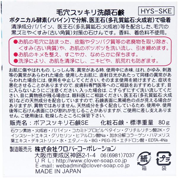 毛穴スッキリ洗顔石鹸 HYS-SKE 80g商品区分:化粧品●皮脂よごれを洗浄し、毛穴をスッキリおそうじ!●ボタニカル酵素(パパイン)で分解、医王石(多孔質鉱石:火成岩)で吸着。